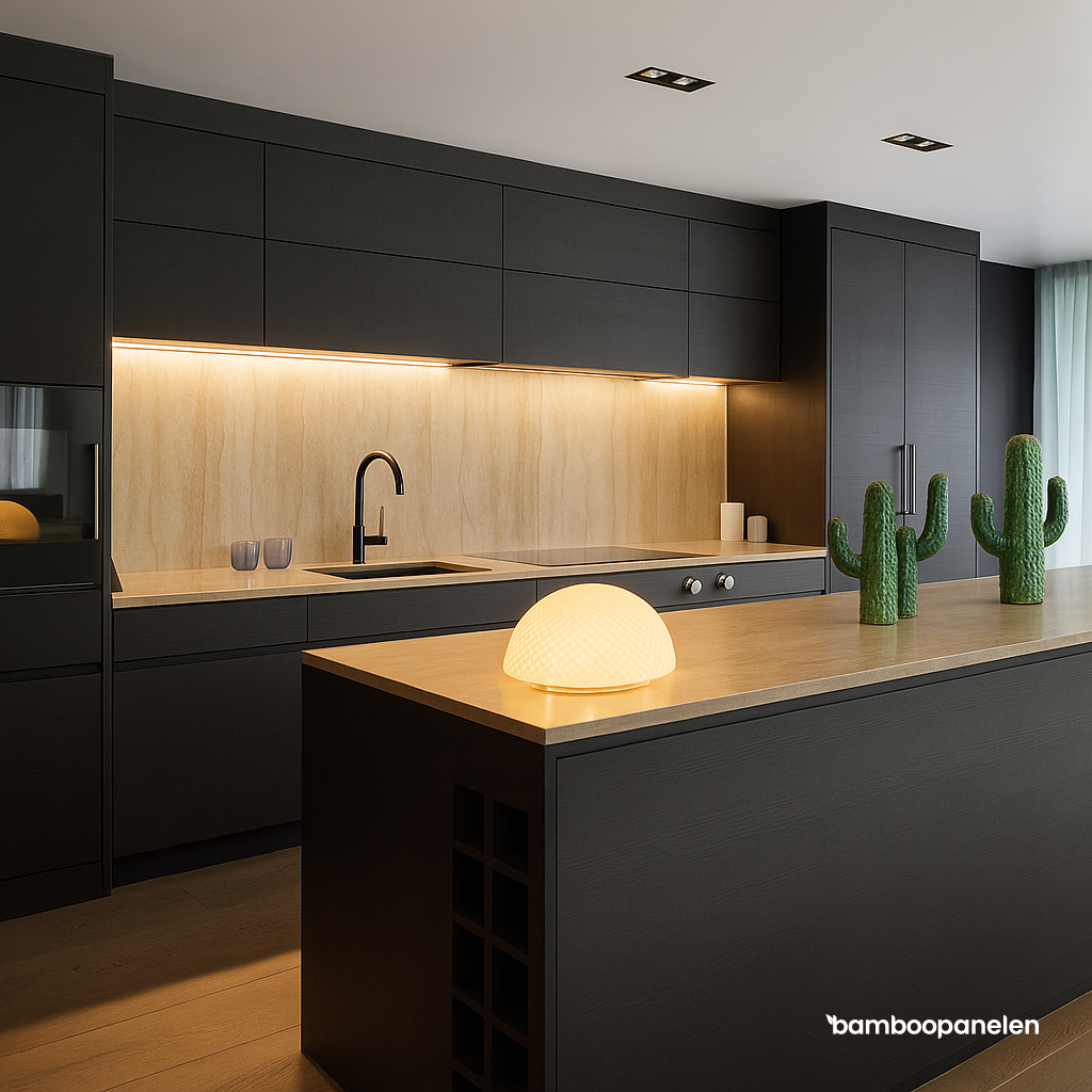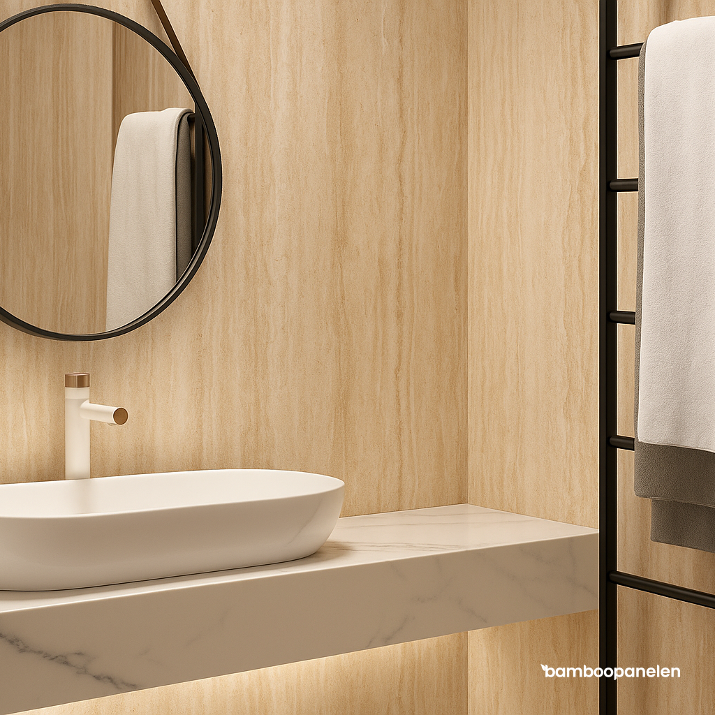Maak van jouw wand een warme en elegante eyecatcher – met de zachte luxe van travertin en de duurzame kracht van bamboe.